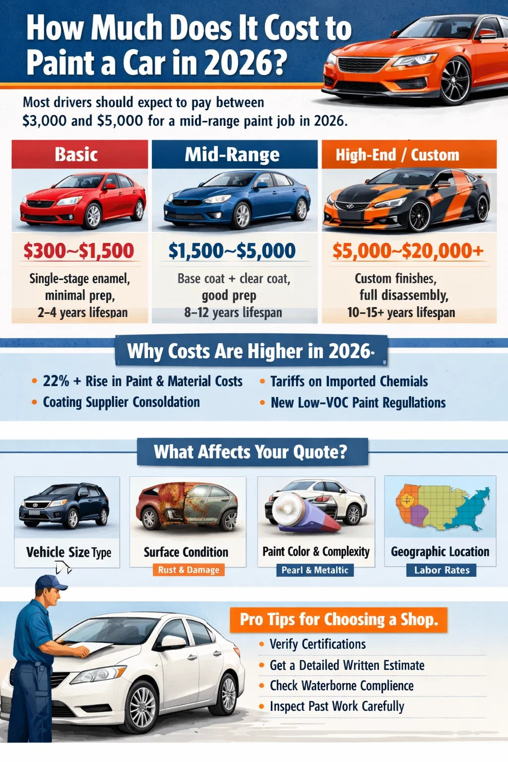A resposta curta para 2026: a maioria dos motoristas deve esperar pagar entre US$ 3.000 e US$ 5.000 por uma pintura sólida de médio porte , com opções de orçamento começando em torno de US$ 300 a US$ 1.000 e trabalhos premium ou personalizados atingindo US$ 10.000 a US$ 20.000 ou mais. Essa referência intermediária mudou para cima em comparação com apenas alguns anos atrás. Os custos de tintas e materiais aumentaram mais de 22% desde 2022, impulsionados pela inflação, tarifas sobre compostos químicos importados, mudanças regulatórias da EPA e consolidação contínua entre os principais fornecedores de revestimentos. Todas essas pressões continuam em 2026 – o que significa que as cotações que você recebeu há 18 meses provavelmente não serão mais precisas.