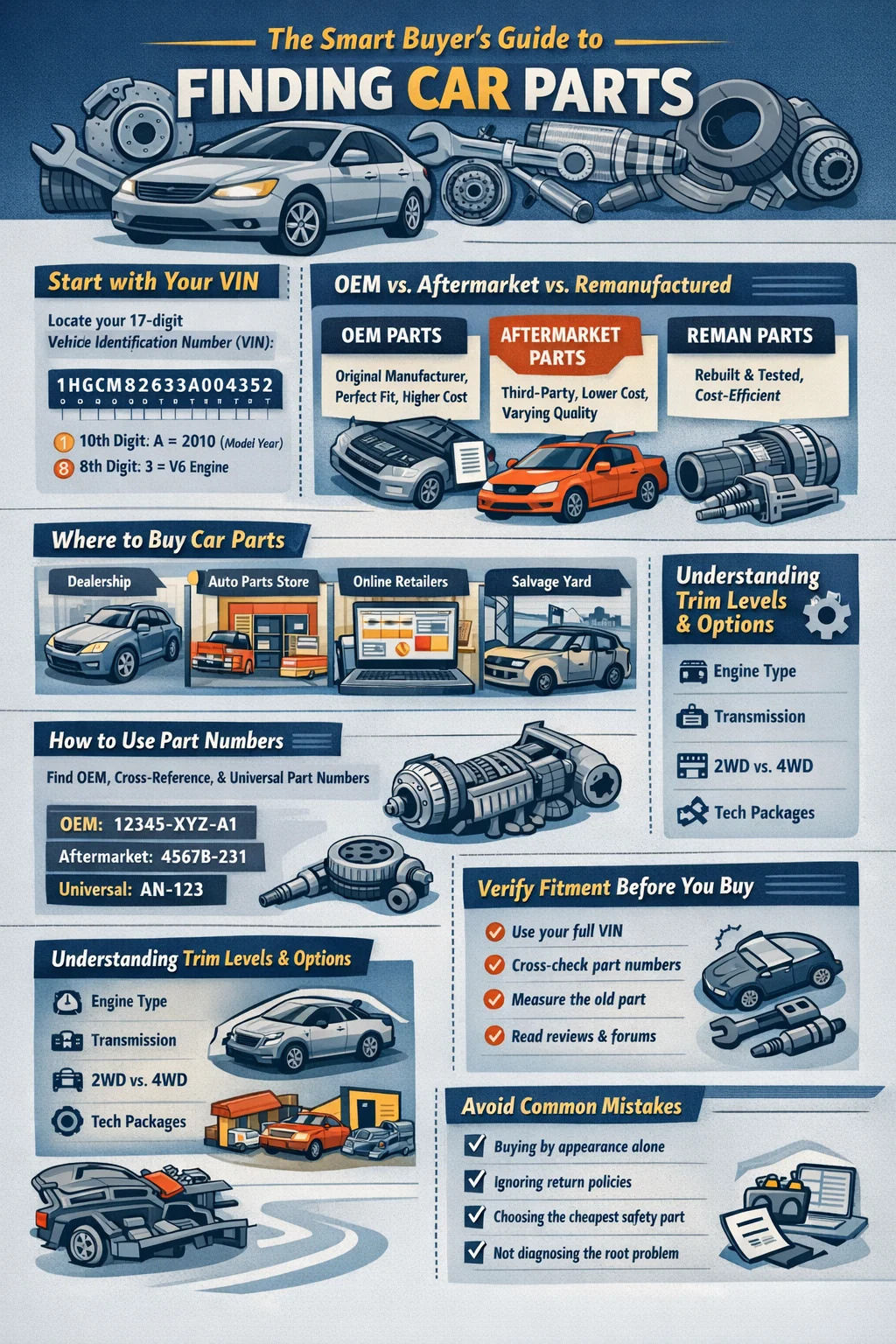 Encontrar as peças certas para o seu carro se resume a um ponto de partida inegociável: você deve saber o ano, marca, modelo, tamanho do motor e nível de acabamento do seu veículo antes de pesquisar qualquer peça de automóvel . Sem essas informações, mesmo uma peça que pareça idêntica pode não encaixar ou funcionar corretamente. Depois de ter esses detalhes bloqueados, o processo se torna muito mais simples – quer você esteja comprando em uma concessionária, um varejista on-line, um ferro-velho ou uma loja de peças de automóveis. Este guia percorre cada etapa desse processo com detalhes práticos.