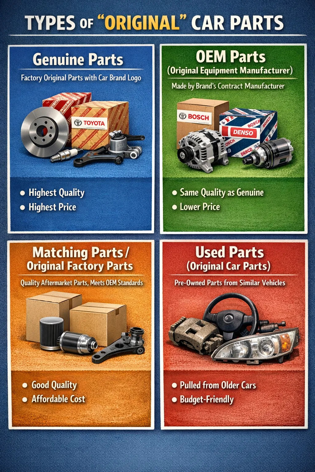 Quando as pessoas falam sobre peças de automóveis “originais”, na verdade vários termos diferentes são usados. Embora possam parecer semelhantes, na boca de mecânicos ou donos de lojas de peças de automóveis, esses termos diferentes geralmente representam diferentes faixas de preço e origens desses peças automotivas .