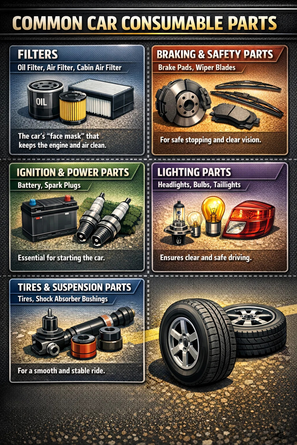 No mundo dos automóveis, algumas peças se desgastam rapidamente e são muito procuradas, o que as torna facilmente disponíveis em qualquer loja de peças automotivas ou oficina mecânica. Essas peças automotivas são comumente chamadas de “peças consumíveis” ou “peças comumente usadas”.