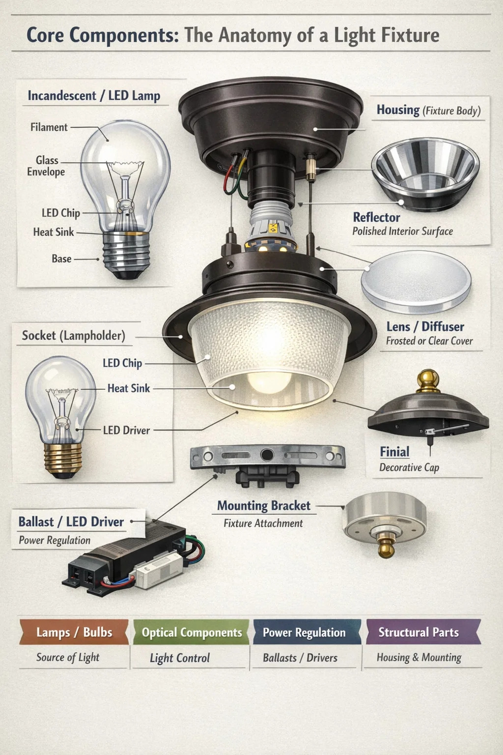 Uma luminária, muitas vezes referida em termos técnicos como luminária, é composta por vários peças de iluminação que trabalham em uníssono para fornecer iluminação. As partes mais fundamentais incluem o lâmpada (lâmpada) , o tomada , o carcaça (corpo do dispositivo elétrico) , e o lente ou difusor . Enquanto a lâmpada cria a luz, os demais componentes são responsáveis por mantê-la no lugar, protegê-la e direcionar o feixe de luz para a área desejada.